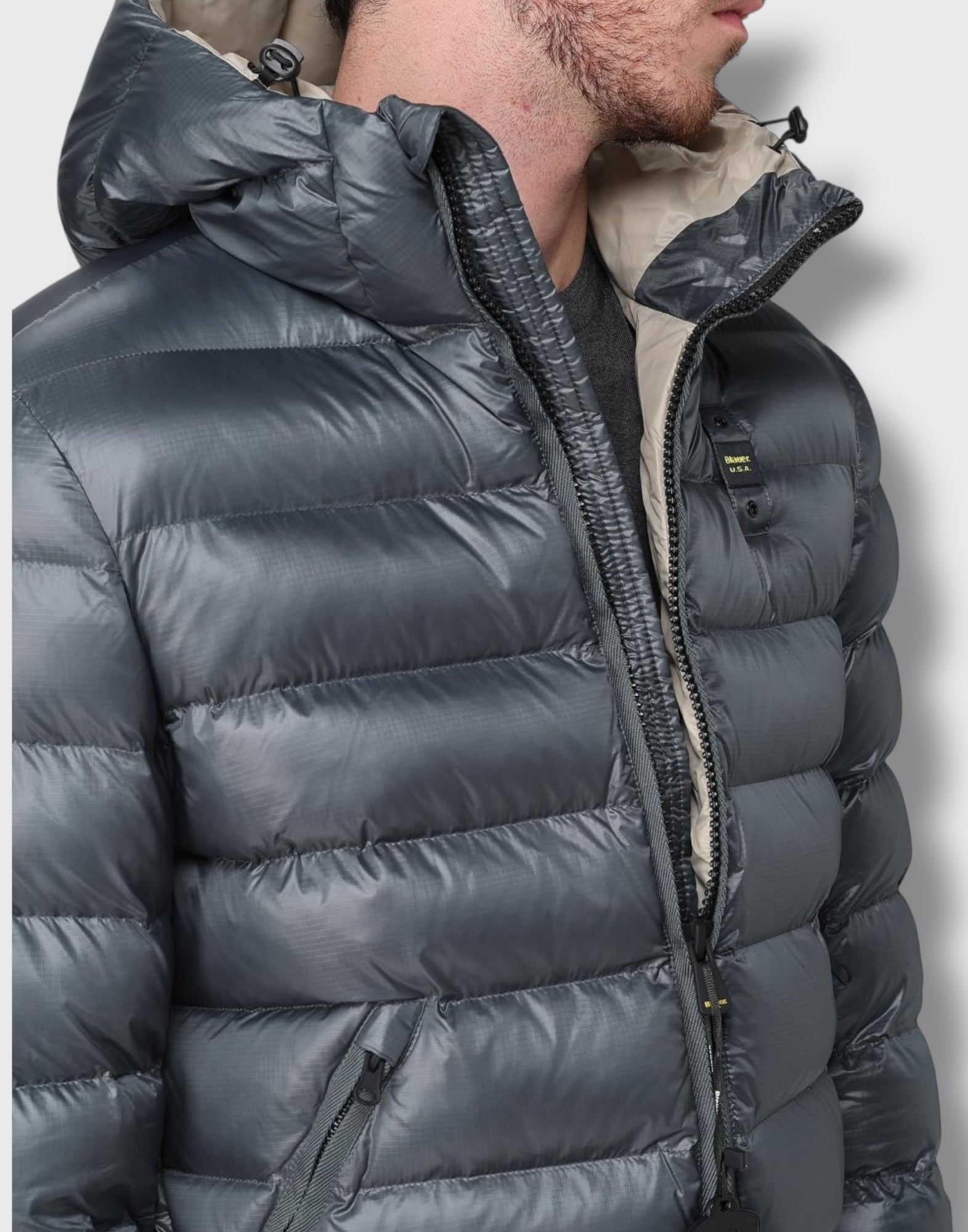 Giubbetto uomo idrorepellente in nylon micro-rip con leggero motivo check. Modello dalla classica siluette, indicato sia per la città metropolitana sia per il tempo libero.Imbottito in ovatta per offrire il maggior confort, assicurare calore e protezione e riservare una particolare attenzione al riciclo di fonti rinnovabili.• Cappuccio fisso con coulisse• Foderato in contrasto colore• Imbottito ovatta Sorona® Aura• Chiusura con zip nascosta• Copri cursore sul collo• Tasche con zip• Coulisse sul fondo• Tasche interne una con zip e l altra con velcro• Patch e passante con logo