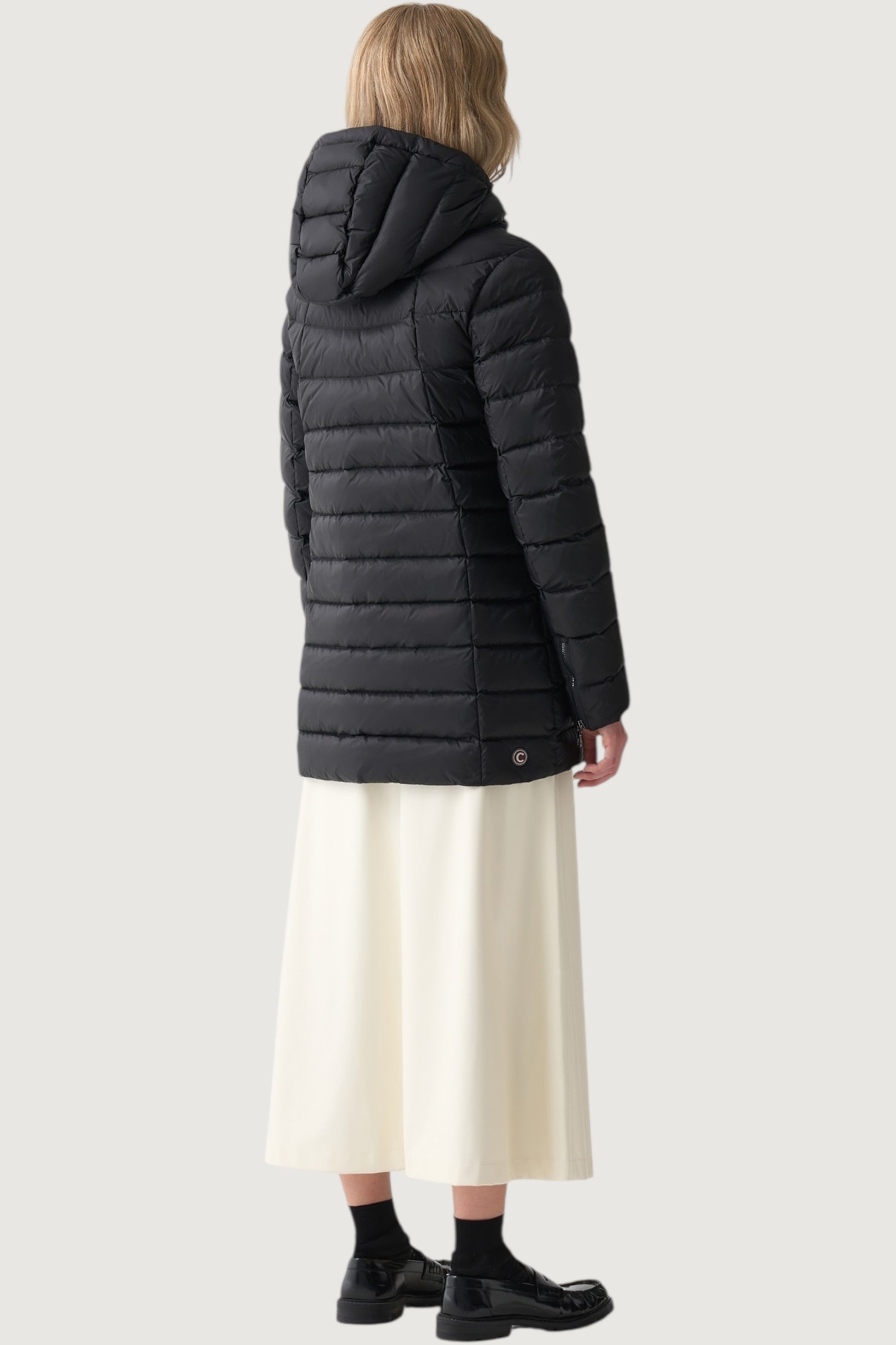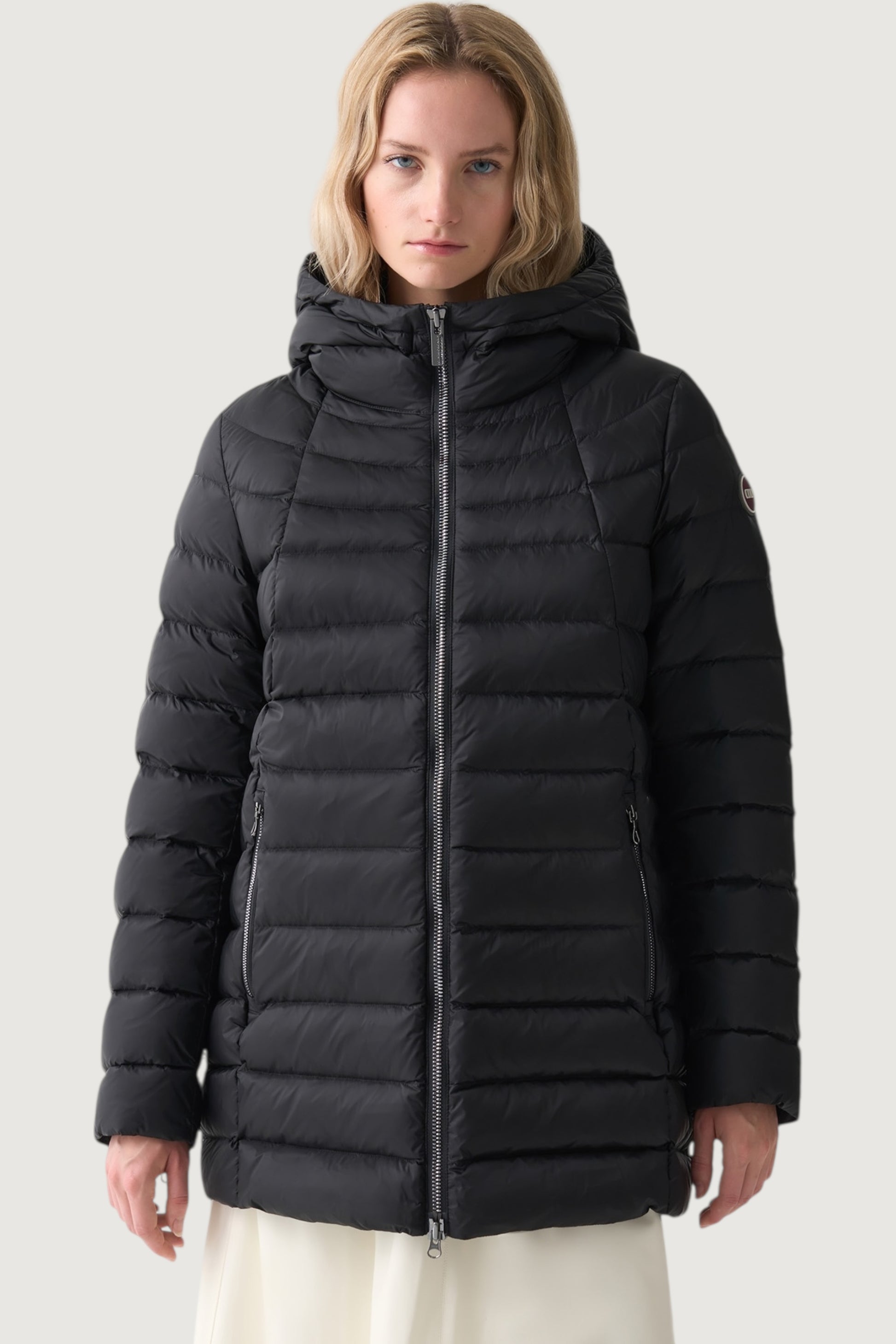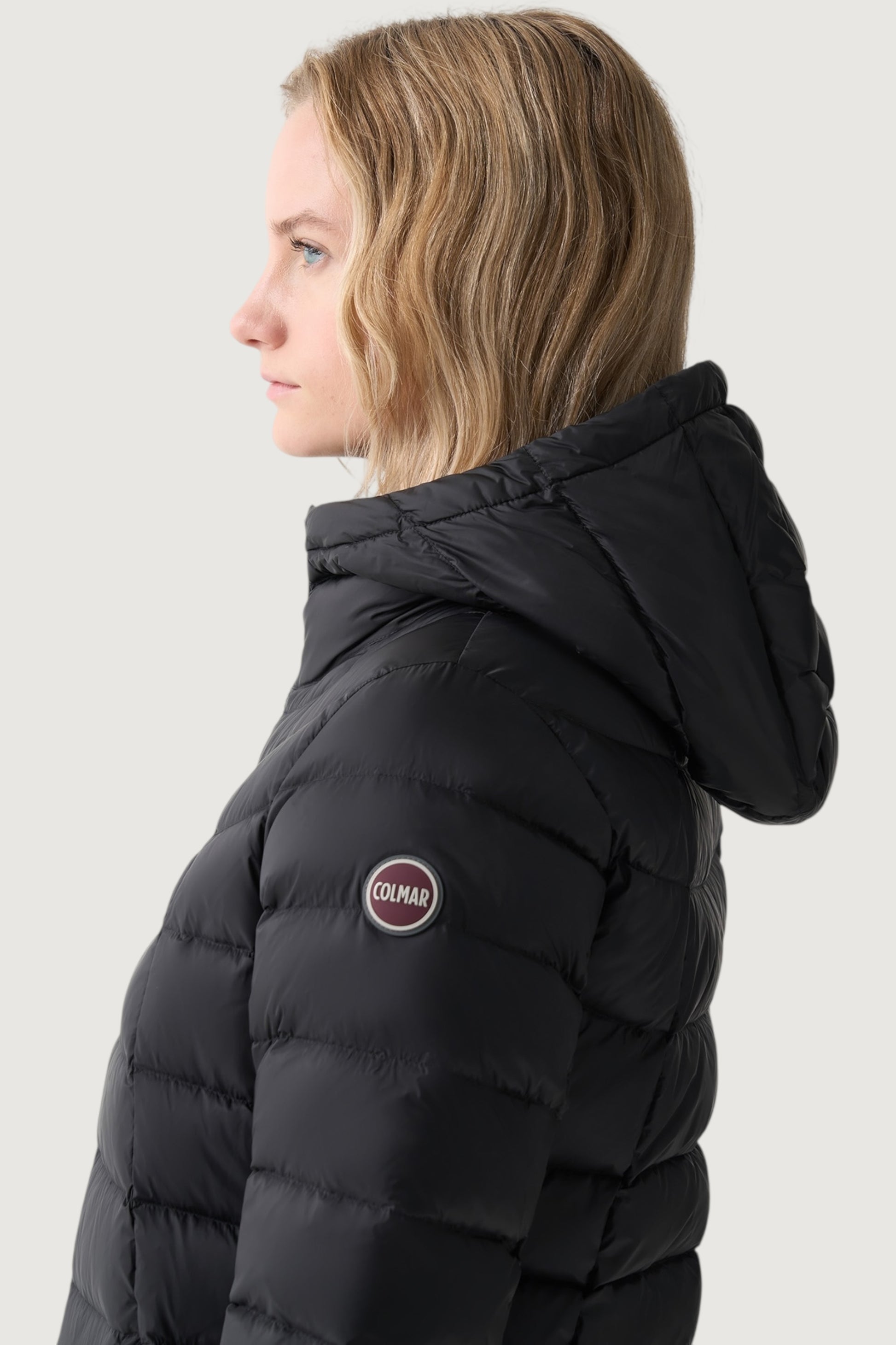 Con un fit impeccabile grazie alle linee verticali, questo piumino dal design a trapezio con cappuccio e coulisse offre protezione dal freddo con comfort e stile. Il finish cangiante aggiunge un tocco di eleganza, mentre le tasche laterali garantiscono praticità.Protegge dalla pioggia leggera, respingendo l'acqua e facendola scivolare via dalla superficie sotto forma di gocce. Trattamento ecosostenibile.Ideale per climi freddi e condizioni in cui è richiesta una buona protezione dal freddo, isolamento termico avanzato.
