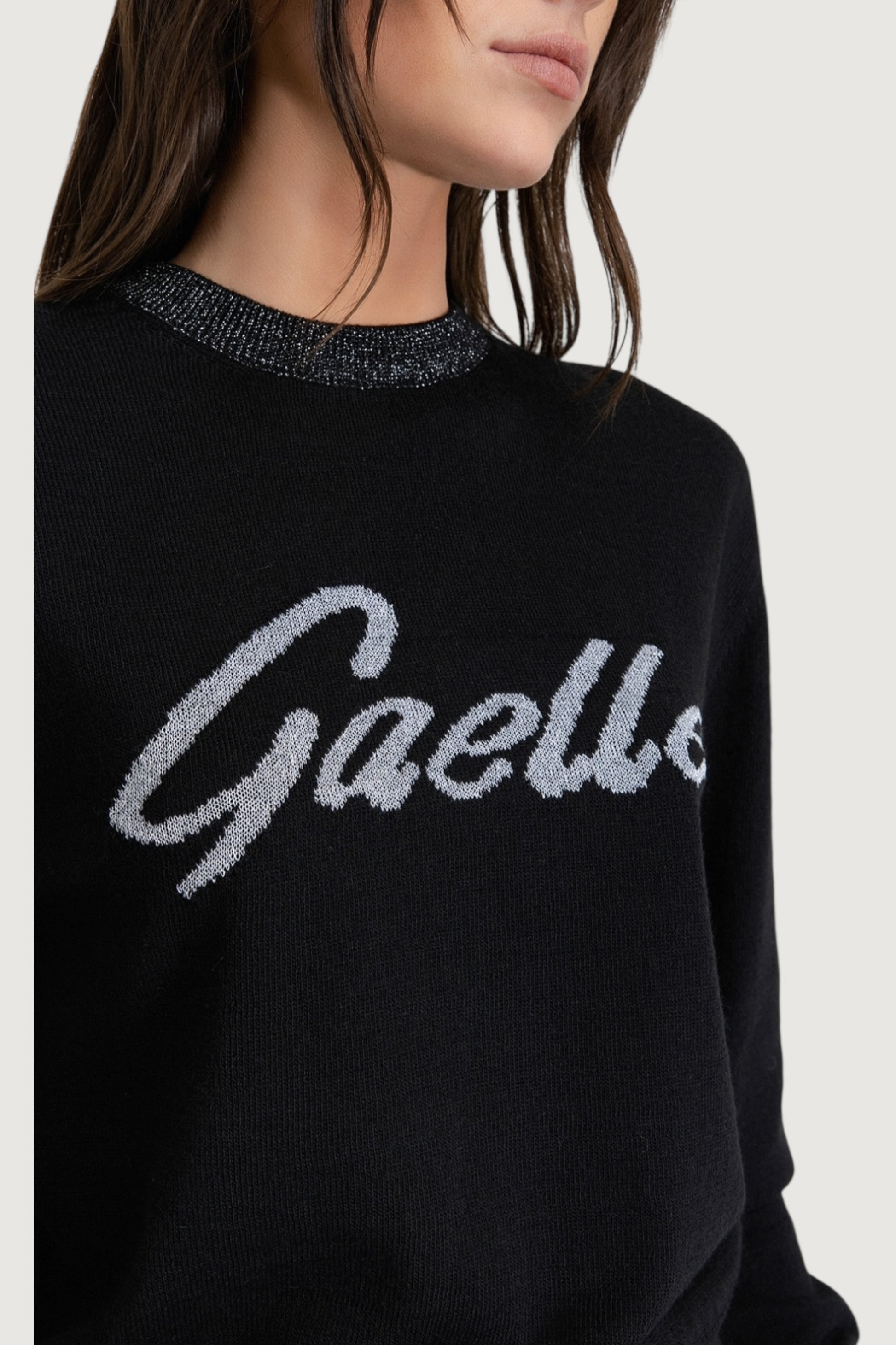 Maglioncino con scritta in lurex e dettagli lurex su girocollo e polsini