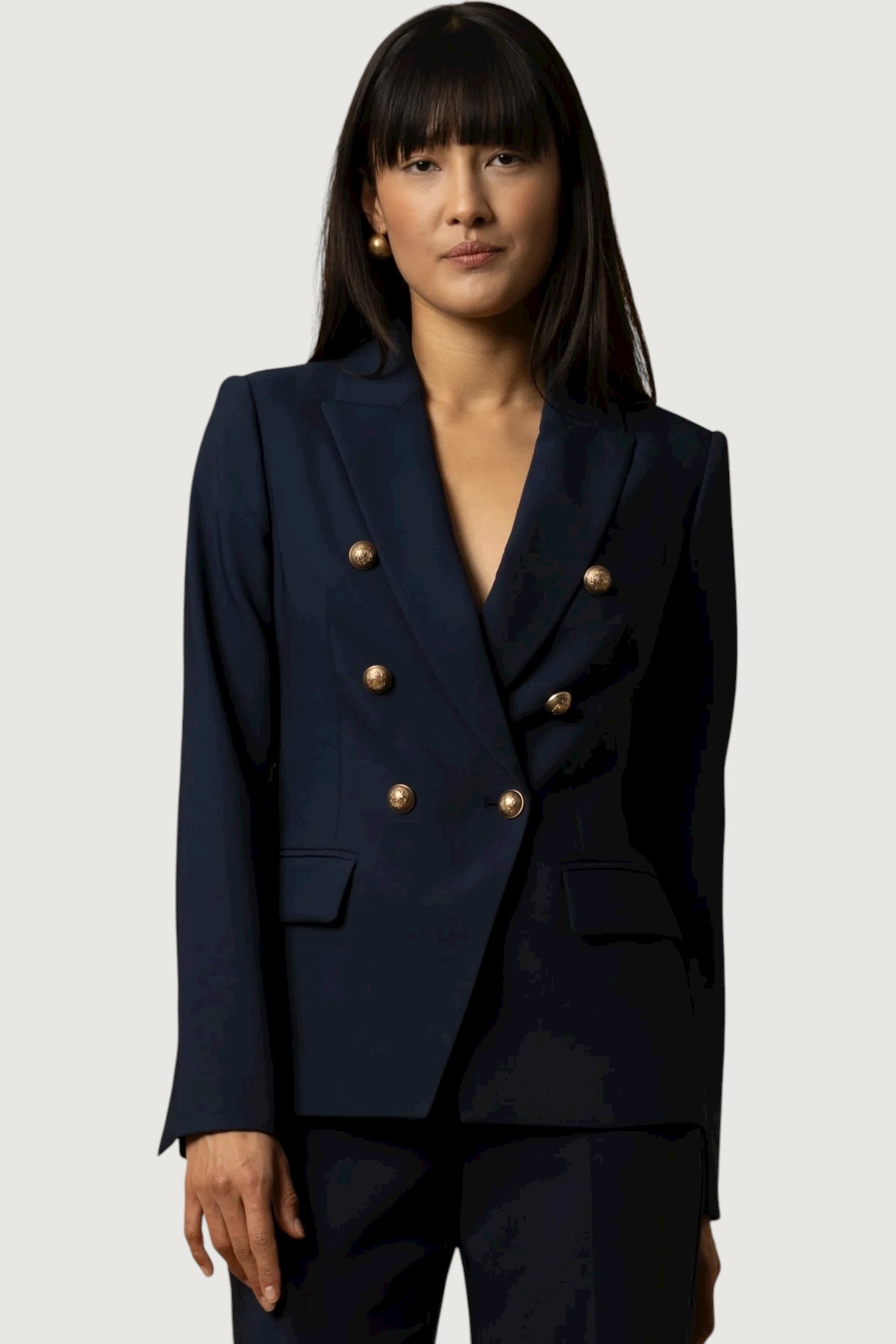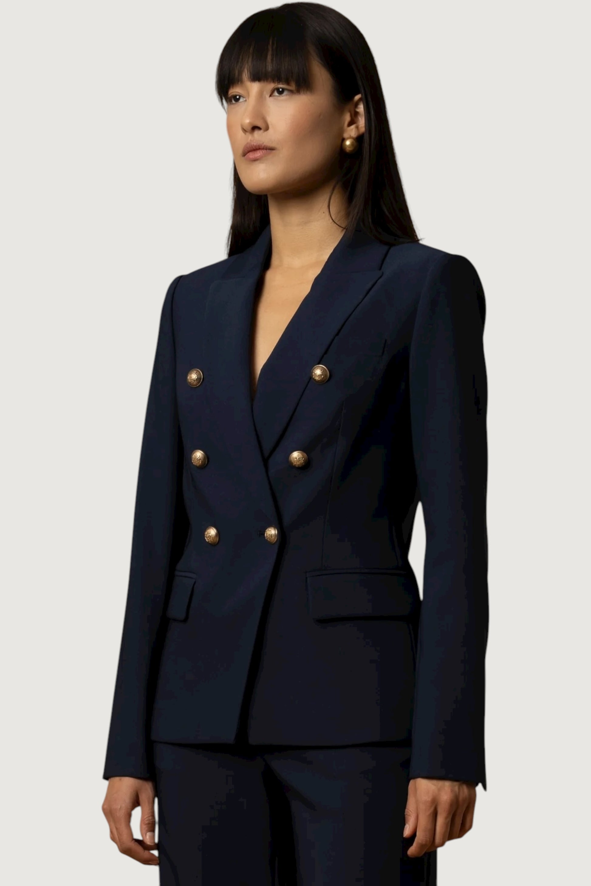 La linea avvitata di questa giacca è impreziosita dalla chiusura doppiopetto con bottoni gioiello. Il capo presenta collo con revers e tasche a filetto sui fianchi.