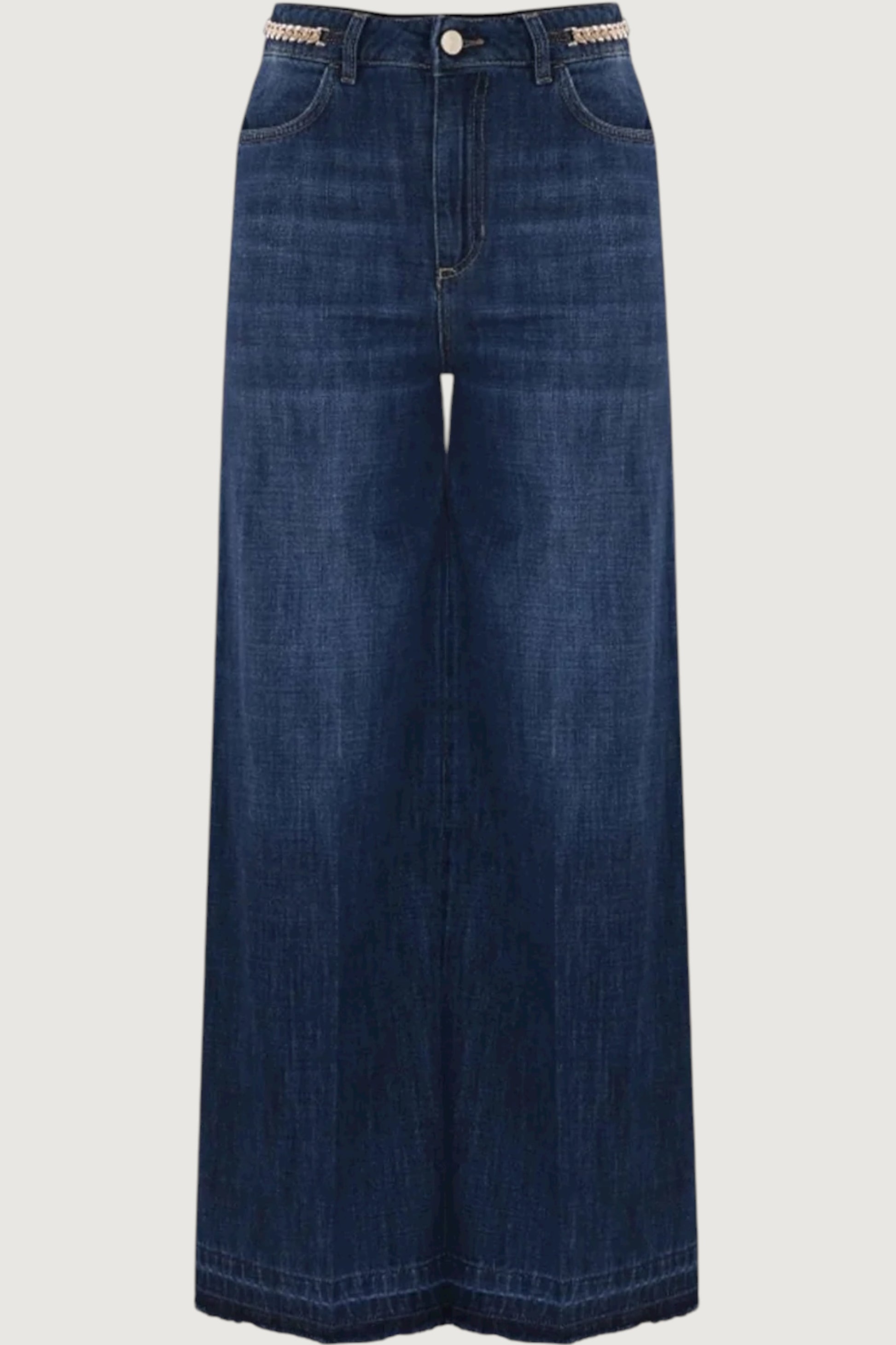 Perfetti per un look casual chic, questi pantaloni in denim di cotone a gamba larga sono impreziositi dal dettaglio di catene dorate che strutturano la vita. Questo modello presenta la piega stirata, tasche, chiusura con zip nascosta e bottone logato