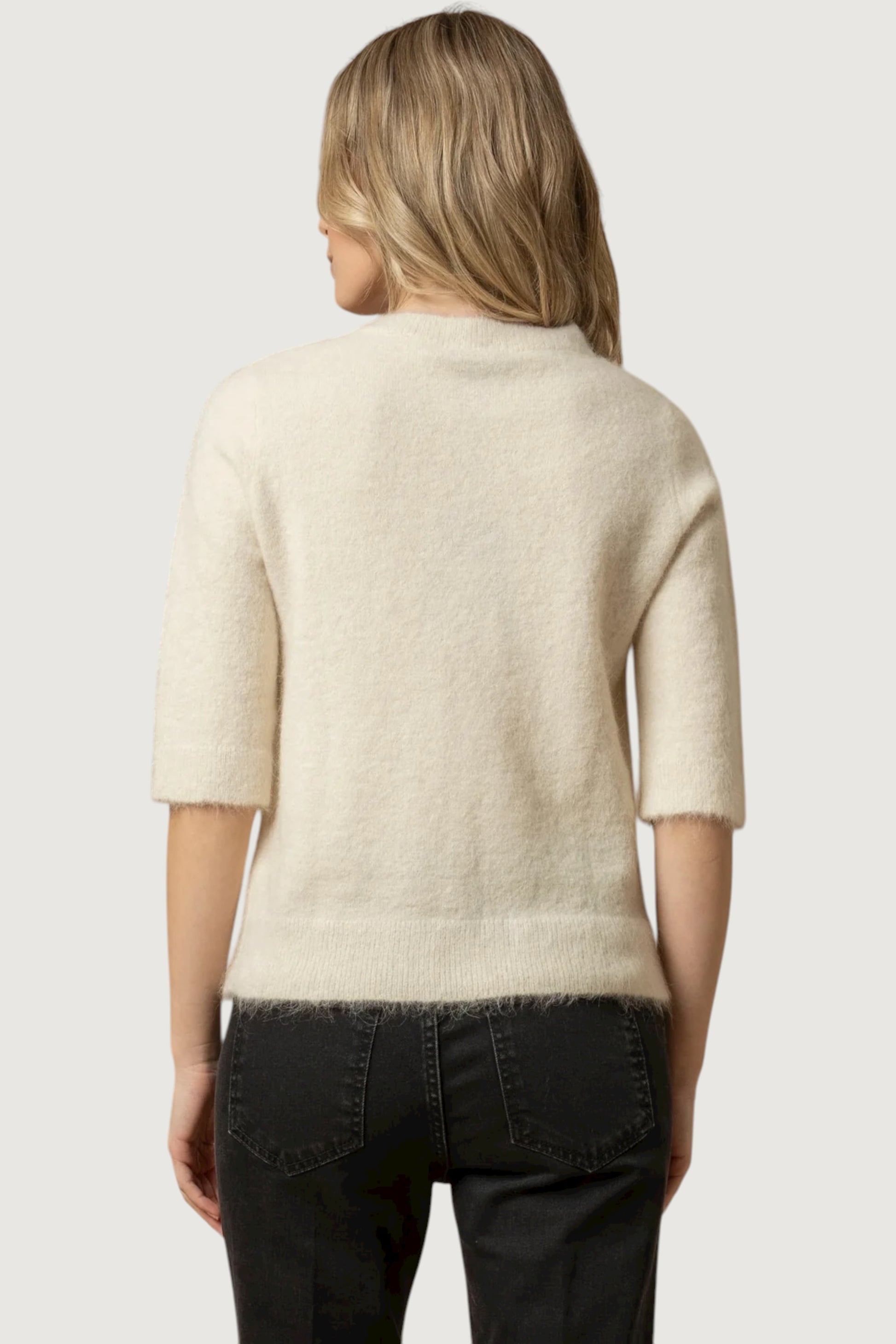 Lo stile classico di questa maglia con maniche a tre quarti è sottolineato dal dettaglio in perle sullo scollo e sul davanti. Il capo presenta lo scollo rotondo e bordi a costine.